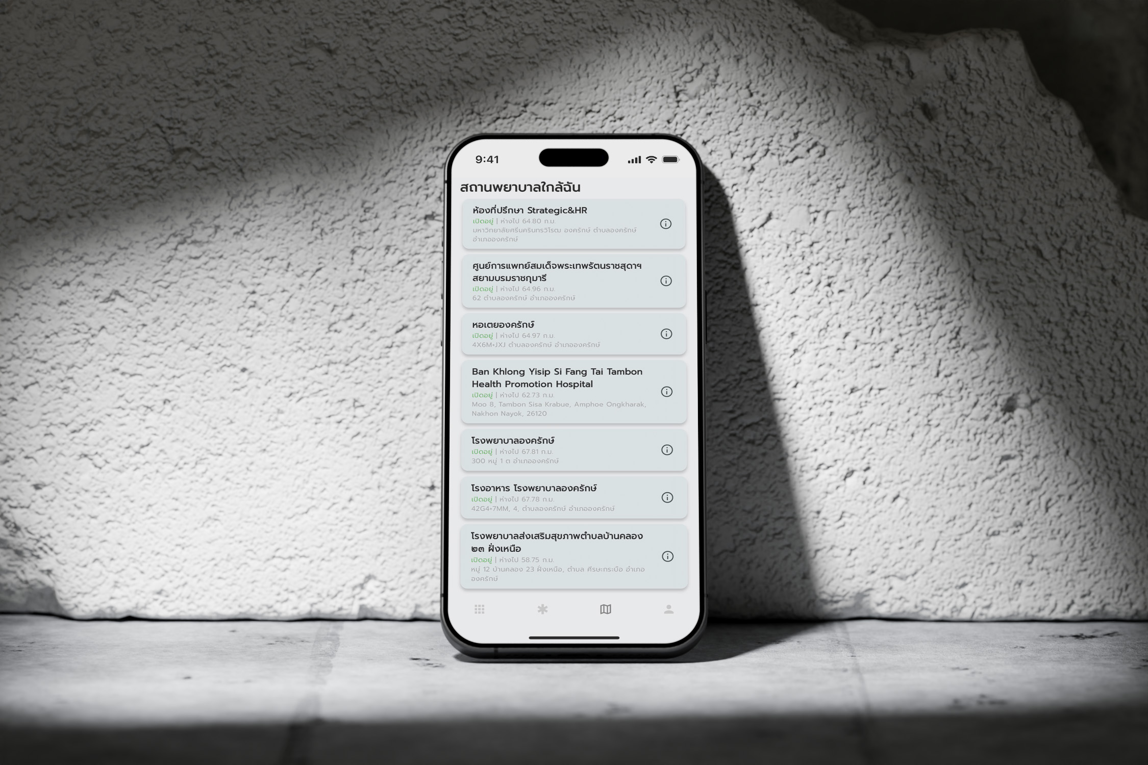However, this application also has a function to help find medical facilities near us, such as hospitals. or community nursing station Based on information from the location of that mobile phone The user will then be able to choose to view information about that hospital. and can navigate to that hospital as well